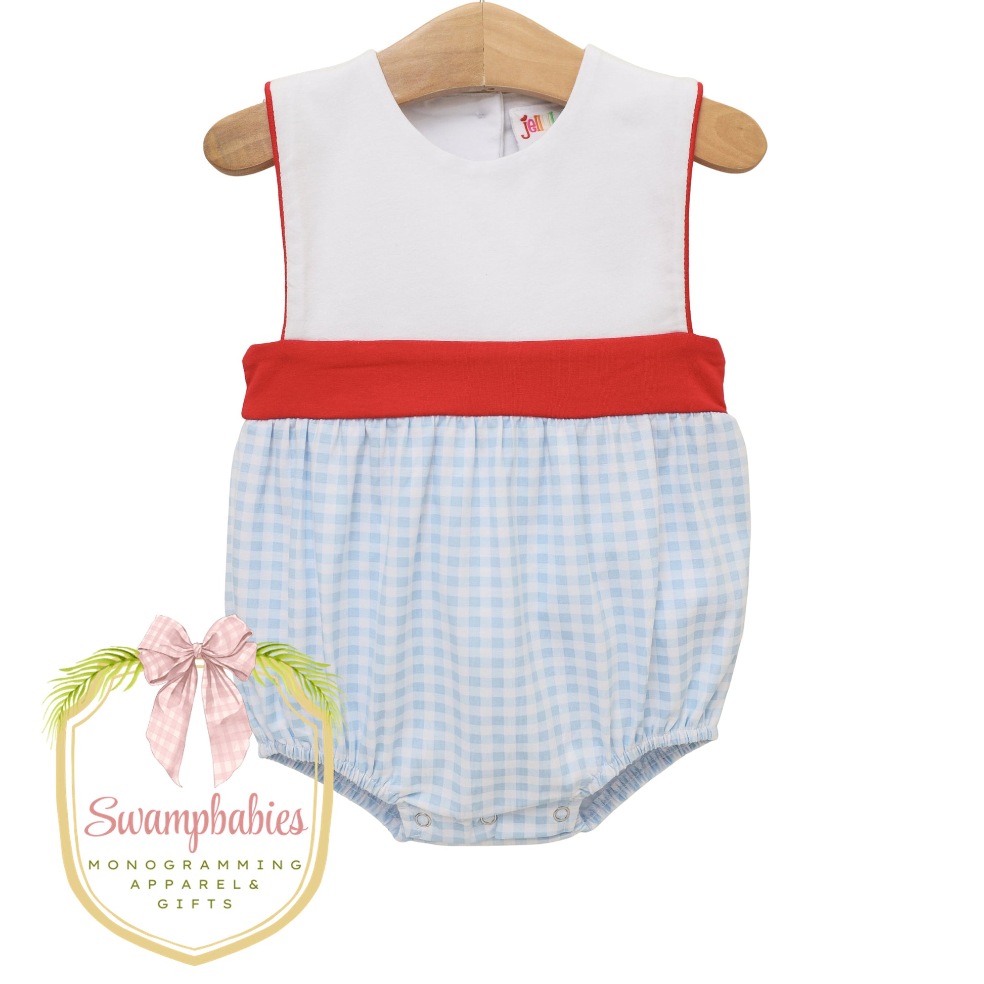 A sweet Southern staple for little gentlemen. The Benjamin Bubble features a crisp white bodice, bold red waistband, and soft blue gingham bottom for a timeless, polished look. Finished with snap closures for easy changes and perfect for monogramming—this classic style is made for summer days and special occasions alike.